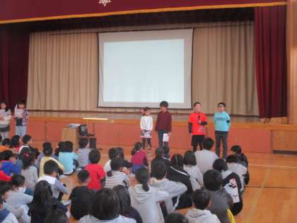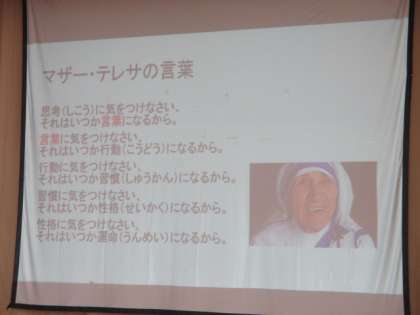 今日,にこにこ集会で先月学習したふりかえりを学級代表が全校の前で発表してくれました。その後,先生からマザーテレサのお話がありました。言葉の大切さについてお話いただきました。とても大切な話でしたのでご家庭でも聞いてみてください。