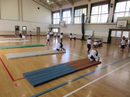 マット運動の学習が始まりました。新しい技に挑戦したり,できる技を美しく連続でできるようにしたりして頑張っています。