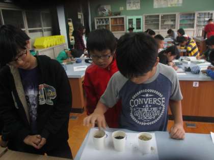 運動場のいろいろな場所にある土を比べました。粒の大きさ,色,手触り,いろいろな視点から土について理解を深めました。粒の大きさを調べるためにふるいを使いましたが,小さい時を思い出したのか,授業のあとも土とたわむれる子がいました。