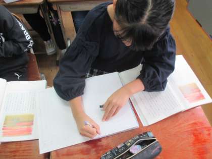 国語科では,「大造じいさんとガン」を学習しています。今日の学習は,「中心人物を探し,場面をまとめる」という学習をしまた。子どもたちは文章中のかぎかっこや,文章の視点を読み取りながら中心人物を見付けていました。