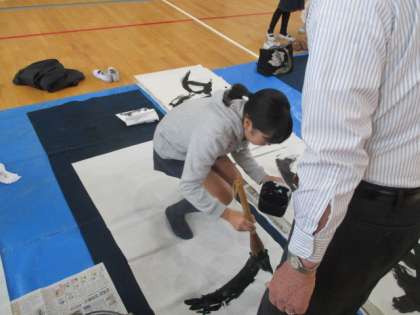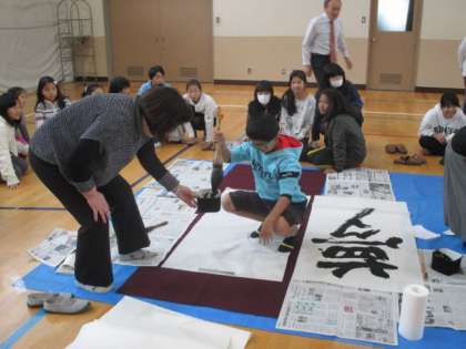 代表者が大きな半紙に「夢」と書きました。いろいろな書体を先生に教わりながら書きました。休み時間にはやりたい子が残って書かせてもらっていました。