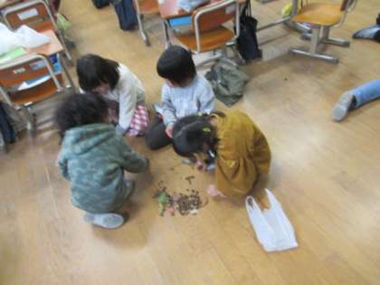 土日の間に,もう一度下鴨神社に行ったり,少し遠い御所まで,秋見つけをしに行った子もいたようです。40個以上の松ぼっくりを持ってきてくれました。みんなでかざりに使いますね。