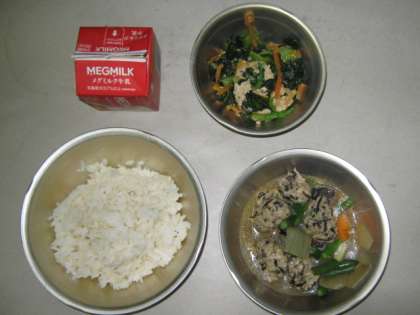今日の給食は,ごはん・牛乳・つくねと野菜のたき合わせ・小松菜の煮びたしでした。つくねと野菜のたき合わせは,初めての献立でした。鶏のミンチ肉に,ひじき・しょうが・片くり粉を入れて団子をつくりました。やわらかい団子で,野菜とよくあっておいしかったです。小松菜の煮びたしも歯ごたえがあり,ごはんにもよくあっていました。