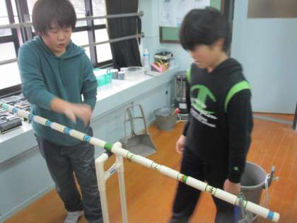 理科の学習で「てこ」の単元に入っています。てこによって,手ごたえがどう変わるのかを調べています。実験したことを自分の言葉でまとめ,考えたことを残しています。次はてこのきまりを調べます。