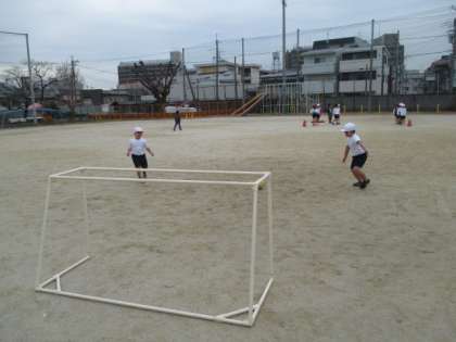 体育科のボールけり遊びの学習です。学習の初めに,シュートとドリブルの練習をしました。ボールに親しんでほしいと思います。