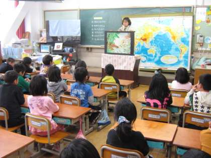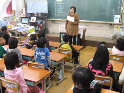 4じかん目の学活では「ふえふきトルセ」というかんこくのかみしばいを見ました。そのあとに、チエ先生からかんこくごとかんこくごでカエルのうたをうたいました。
