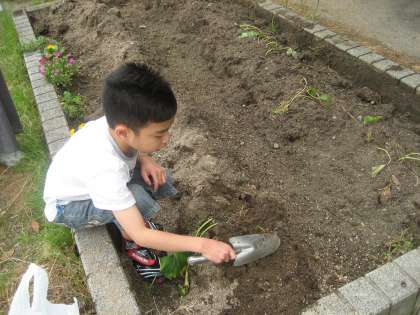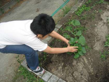 えのき学級では,生活単元学習でさつまいもの苗をうえました。これから毎日,水やりや観察,調べ学習をしていきます。秋には調理実習をする予定です。収穫をするのがとても楽しみです。