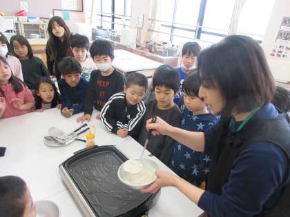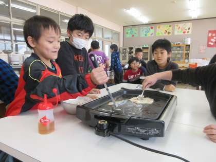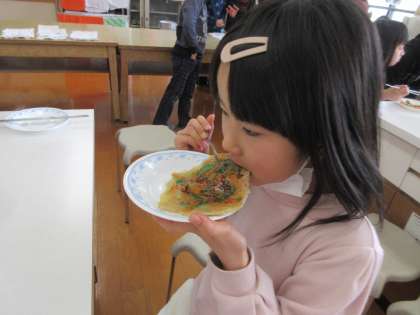韓国朝鮮の文化理解の一環でチヂミを作りました。「マシッソヨ(おいしい)」などの食事の時に使う言葉も少し覚えました。