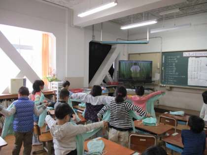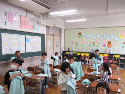 3時間目には,給食について学習しました。養正小学校のみんなの給食を2人の調理員さんが作っていることを知った1年生はとても驚いていました。給食の約束についてもみんなで考え,最後には,給食エプロンのたたみ方も歌に合わせて練習しました。