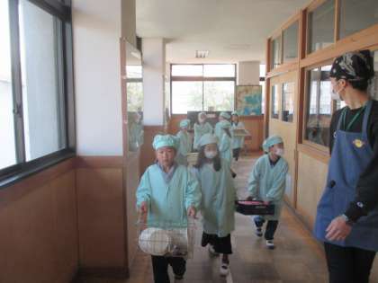 美味しい給食がはじまりました。給食当番の子たちもがんばって運んでくれています。準備もとっても早く,ゆっくり給食も食べられました。