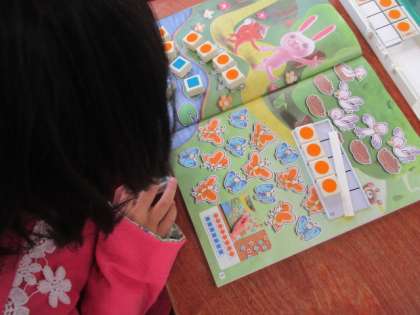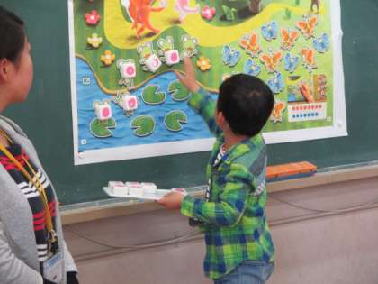 数図ブロックをつかって,かえるとはすの葉を数えています。全体の前での発表にもチャレンジしています。