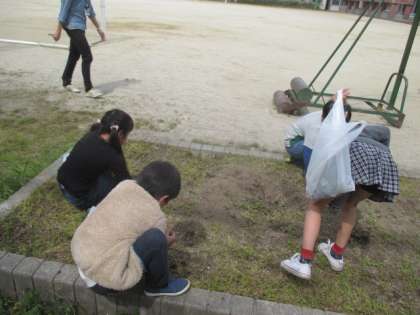 掃除の時間に畑仕事をしています。どんどん雑草を抜いてきれいな畑を作りましょう。