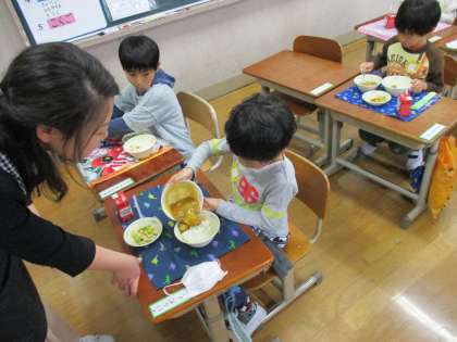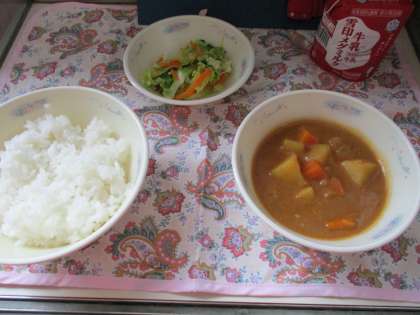 今日の給食は,ごはん・牛乳・チキンカレー・ソテーでした。チキンカレーは,給食室でルーから手作りをしています。カレーのいいにおいが給食室からしていて,子どもたちはわくわく楽しみにしていました。ごはんにかけておいしくいただきました。