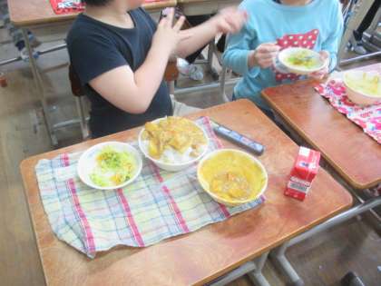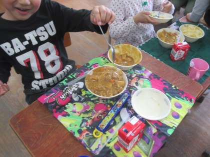 給食よく食べます。今日はカレーで特にたくさん食べていました。もっともっと食べて元気な体を作りましょう。