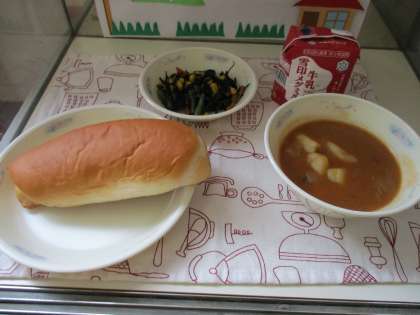今日の給食は,味付けコッペパン・牛乳・ビーフシチュー・ひじきのソテーでした。ビーフシチューのルーは給食室で手作りしています。チーズも入っていてまろやかです。写真は,6年生がランチルームで給食を食べている様子です。会話を楽しみながら食べられましたね♪