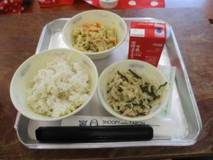 今日の給食は沖縄料理でした。クーブイリチー,油揚げのチャンプル,パインゼリーと暑い今日の天気の中沖縄さながらの給食をみんなでおいしくいただきました。