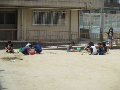 3年生では団子作りが流行っています。砂をたくさんかけて,きれいな形を作っていました。