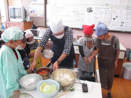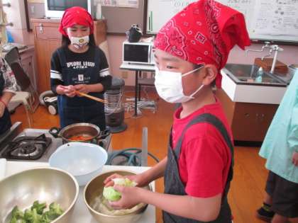 今日は初めての調理実習でした。各グループで協力し,ゆで野菜のサラダを作りました。慣れた手つきの子も多く,家庭でのお手伝いの様子が目に浮かびました。作ったサラダは「おいしい」と言いながら,残さず食べることができました。