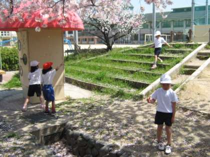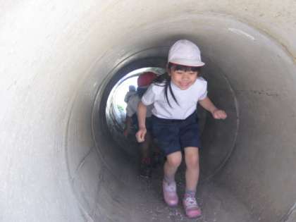 そのあと、ドリームワールドへあそびにいきました。きょうしつにいても「あそこにあそびにいきたい」というほど、みんなはドリームワールドがだいすきです。どかんをくぐってみたりやまにのぼってみたり、かんさついけをのぞきこんだりして、たのしくあそびました。