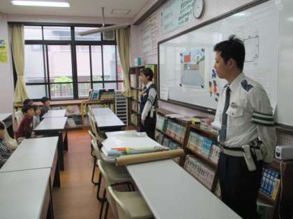 まずは,警察官の方に「安全に道路を歩くために」のお話をしていただきました。