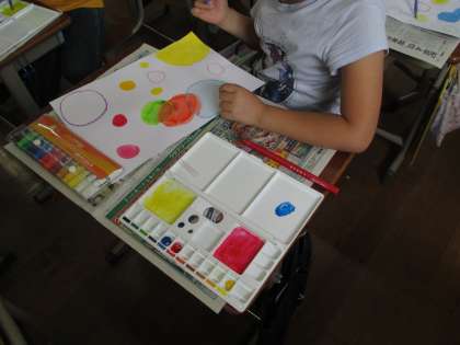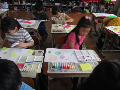 3年生の図画工作科の時間に,水彩絵の具を使って色づくりにチャレンジしました。赤・青・黄の3原色を使って,新しい色づくりをしました。また,水の量によって色の濃淡ができることを知りました。できた色をつかってそれぞれのシャボン玉をつくりました。