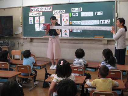 牛乳に含まれる「カルシウム」について子どもたちは興味津々。お茶やオレンジジュースには勝てない,たくさんのカルシウム(カルちゃん)が含まれていることを知りました。牛乳パックの中からは,教室の端から端までの長さのカルちゃんの数が!驚きでした。