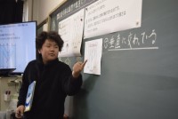 二つのグループに分かれて討論の練習をしています。肯定派・否定派,それぞれ聞き手を納得させる意見を考えて話し合います。聞き手の評価も,根拠をしっかり伝えることができ,よい話し合いになっていました。