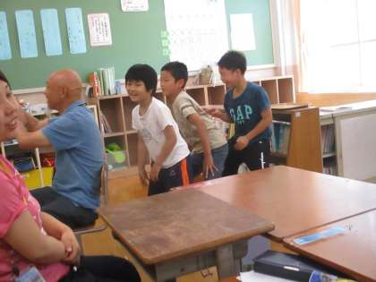 給食を早く食べ終えた男子がみんなで誰もが知ってる○○トレイン?を踊っています。