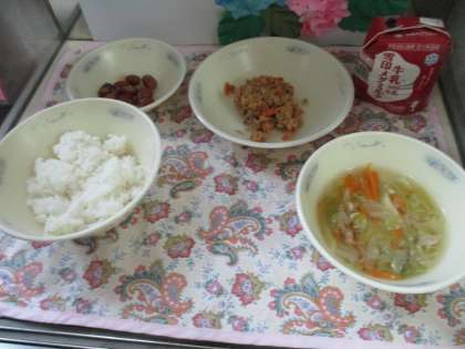 今日の給食は,ごはん・牛乳・おからツナ丼(具)・金時豆の甘煮・キャベツのすまし汁でした。金時豆の甘煮は,スチコンで作りました。中までふっくらとやわらかくできていました。おからツナ丼には,おからパウダーを使用しています。おからにはカルシウムが多くふくまれ,体にとてもいいです。おいしくいただきました!