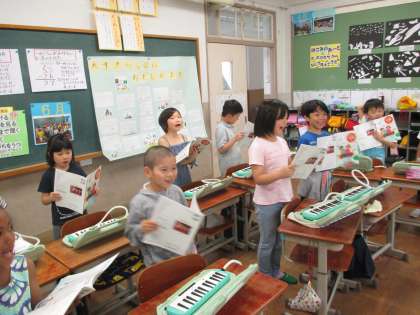 鍵盤ハーモニカの演奏だけでなく,歌唱も頑張っています。