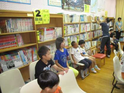 中間休みに東山総合支援学校の生徒の皆さんが1・2年生とえのき学級対象に読み聞かせと絵本劇をしてくれました。いつもの読み聞かせとは違ってスクリーンに映すなど大規模なもので非常に楽しむことができました。