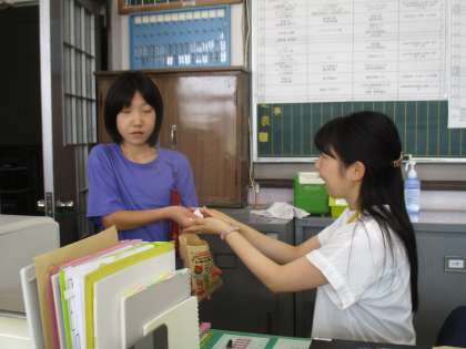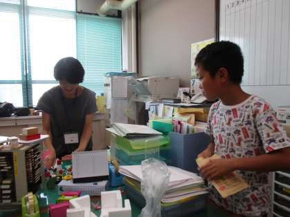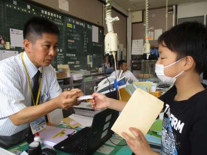 サマースクールのラーメン屋に向けて買出しの練習をしました。実際にスーパーに買出しに行く前に職員室で店員役の教職員に実際のお金を支払い,商品を受け取るというやり取りを練習しました。