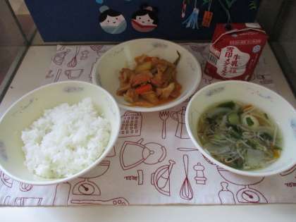 今日の給食は,ごはん・牛乳・タッカルビ・はるさめスープでした。タッカルビは,韓国朝鮮の料理で,鶏肉・にんじん・玉ねぎなどの野菜をコチジャンをベースにしたあまからいタレと炒めた料理です。家でも食べるよ!と言っていた子もいました。おいしく食べることができました♪
