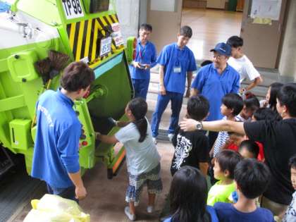 社会科の学習です。京都市清掃局の方々に来ていただきました。パッカー車でごみを入れる体験をさせていただきました。子どもたちは大喜びです。清掃局の方々がいるから,きれいな町になっているんですね。