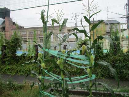 とうもろこしが2mを超え非常に大きく育っています。外見はもうとうもろこしそのものです。あとは中に立派な実がなることを願います。