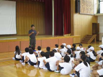 5.6年生は運動会で組体操に取り組みます。今日は初めての集まりで先生から話を聞いたり,実際に1人技の練習をしました。