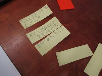 「やさしい」「おもしろい」といった言葉だけでなく,「自分を応援してくれる」「ダメなこともダメと教えてくれる」など,自分の経験などもふりかえって「こんな友だち素敵だな」と書き込んでいました。