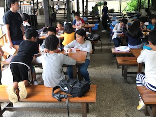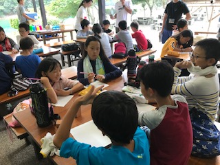 昼食を終え,おうちの人へのおたよりタイムです。どんな内容を書いているのでしょう。楽しかったこと,家族に会いたくなったこと・・・今の気持ちをしっかり文章にしています。
