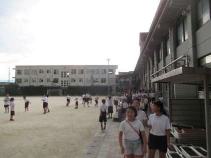 6時間目は100m走のタイムを測る予定でしたが,雷が鳴り始めたので,教室に戻ってダンス練習をしました。写真は,雲の動きがとても速かったのでみんなで観察しているところです。
