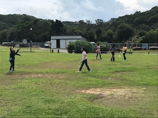 野外炊事までの空いた時間を芝生広場で過ごしました。広い芝生で遊ぶのは楽しいです。