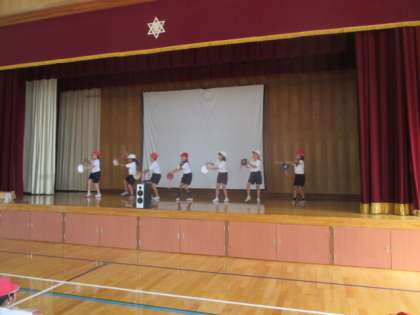 練習をする中でいい動きをしている子には,舞台の上でお手本をしてもらっています。それを見ている子どもたちもどんどん上達しています。