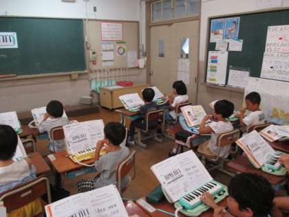 今日の音楽科の時間に「ド」「ソ」の音の位置を確かめて練習をしました。「どんぐりさんのおうち」の曲に合わせて楽しく吹くことができました。同じ音が続くときには,鍵盤に指を置いたままにしておくことを知り,驚いた様子でした。