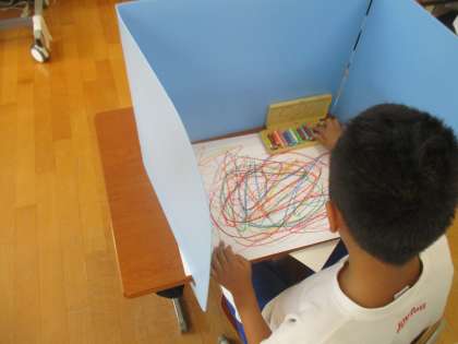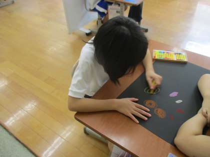 今日は「はなびのひ」という本を聞き,表紙や挿絵を見ずにシーンを回想して絵を描く学習でした。それぞれいろんな花火を想像しながら絵を描いていました。