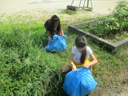 草抜きが終わったあと,学級代表の2人にお願いをして草をまとめてもらいました。みんなで集めた草なのでかなりの重さになりましたが,最後まで運んでくれました。