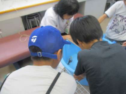 生きものと触れ合うコーナーでは実際に生きものに触れることができました。ザリガニ釣りやドクターフィッシュ,アカハライモリなどを手に乗せるなど普段ではなかなかできないような体験ができました。