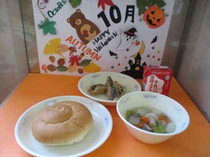 今日の給食は,バターうずまきパン・牛乳・とびうおの香草あげ・ポトフでした。とびうおの香草あげは,今月の新献立でした。パセリやバジルのいい香りがとびうおとよく合っていました。香りを感じながら,おいしくいただきました。