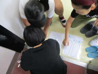 先週の委員会活動で,健康委員会の5・6年生が,トイレのスリッパの足型を新しく作り直して,1つ1つ丁寧に貼り換えてくれました。そのおかげもあり,前よりもスリッパがきれいに並べられていることが多くなってきました。きれいにそろっていると気持ちがいいですね!!