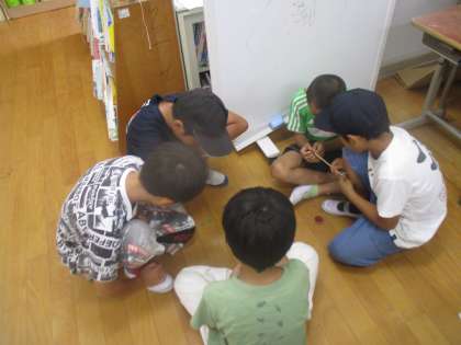 朝休みには4年生がえのき教室に来て,お互いにカマキリを世話し合うなど仲良く過ごしました。