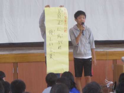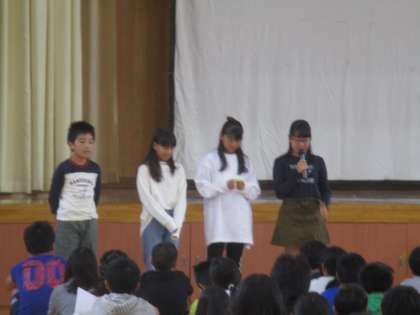 今日は10月のにこにこ集会でした。児童会代表が前期後期のメンバーの入替わりをしました。後期代表の4人も養正を引っ張っていってくれることを期待します。