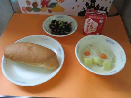 今日の給食は,コッペパン・牛乳・じゃがいものクリームシチュー・ひじきのソテーでした。じゃがいものクリームシチューは,じゃがいもがほくほく柔らかく,手作りのルーがトロっとしていておいしかったです。ひじきのソテーは,今日はスチコンで蒸した人参・コーン・枝豆が彩りよく,きれいでした。スチコンで蒸すと,素材の甘味が引き出され,栄養の損失も少ないです。美味しくいただきました♪